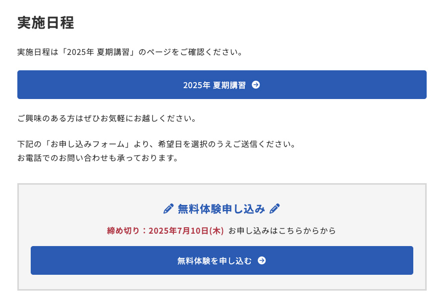 締め切り日が過ぎると、これまで表示されていた無料体験申し込みの枠が非表示になり、「受付終了」のアラートに切り替わります。