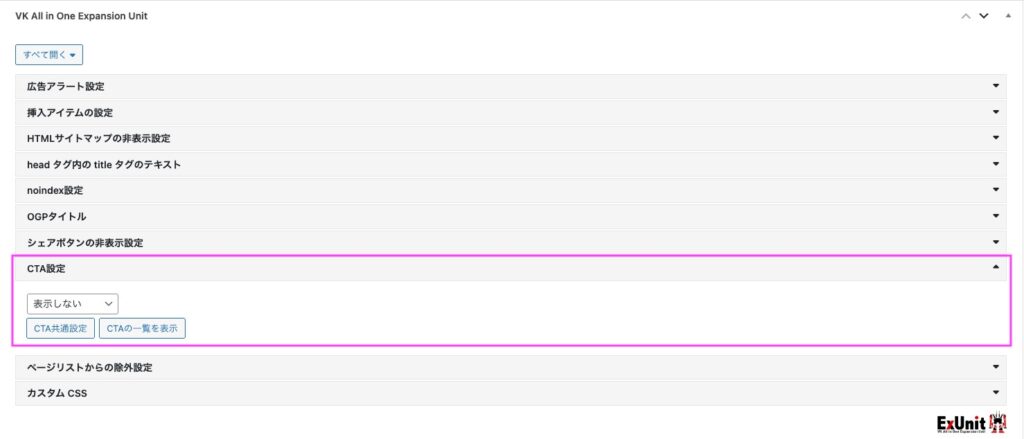 フッター上にある「お問い合わせ」部分は、ExUnit(VK All in One Expansion Unit)プラグインのCTAの機能で表示しています。編集する場合は、編集画面の「CTA」の項目をクリックして、該当の「CTA」の記事を「編集」してください。